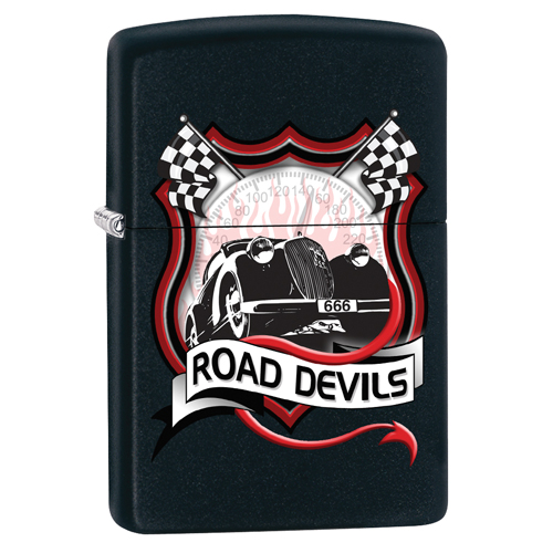 De Zippo road devils is een matzwarte Zippo afkomstig uit de Zippo on the road collectie. Deze zwarte Zippo benzine aansteker is voorzien van een slijtvaste kleurenprint met daarop onder andere de tekst road devils, een hot rod, twee finishvlaggen en een kilometerteller.
