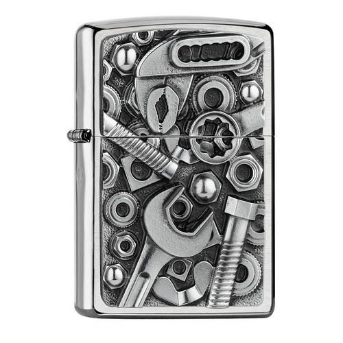 Zippo Screws and Tools 3D. Een geborsteld chroom Zippo met aan de voorzijde een 3D embleem waar gereedschap, schroeven en bouten op staan.