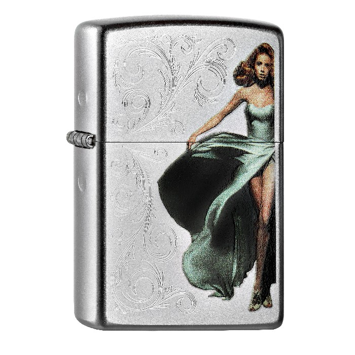 Chromen Zippo aansteker met aan de voorzijde een opdruk van een sexy danseres naast een sierlijke gravure.