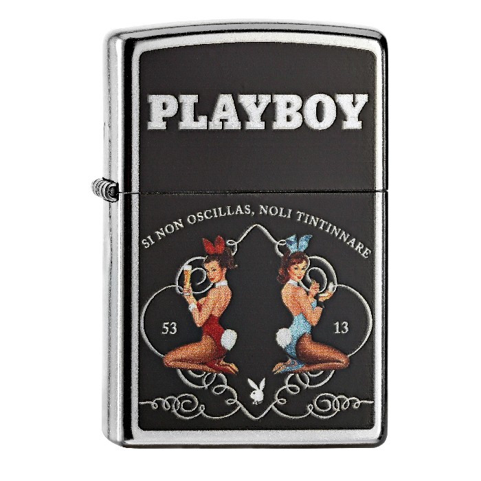 Chromen Zippo aansteker met aan de voorzijde een opdruk van twee playbunny's en het Playboy logo.