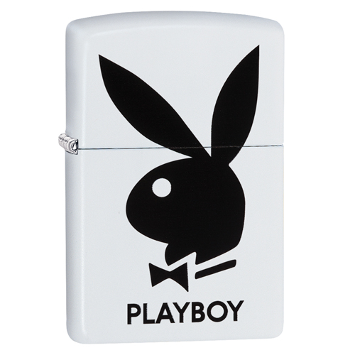 Deze Zippo aansteker heeft een mat witte afwerking en aan de voorzijde een slijtvaste zwarte print van de bekende Playboy Bunny.