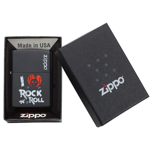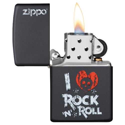 Deze Zippo aansteker heeft een mat zwarte afwerking en is aan de voorzijde voorzien van een slijtvaste print van een hart met een doodshoofd. Het hart vormt samen met tekst de zin: I love Rock'N Roll. Op het klepje is het Zippo logo weer gegeven.