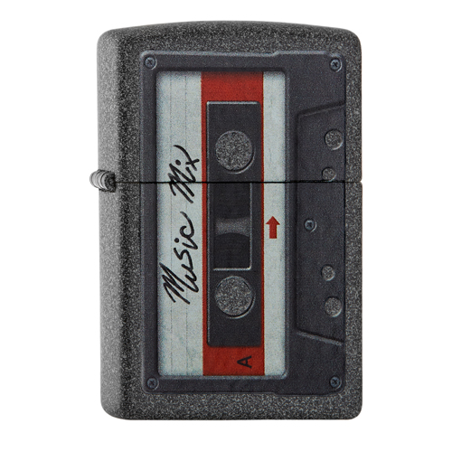 Zippo aansteker met een Iron Stone afwerking en aan de voorzijde een opdruk van een casette band.