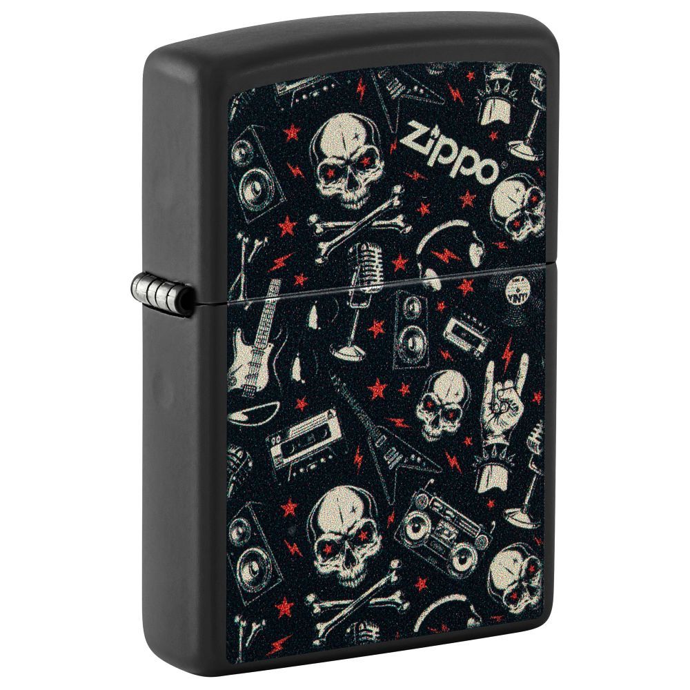 De Zippo Grunt Pattern with Skulls is matt zwart afgewerkt met aan de voorzijde een kleurprint met hierop een patroon van schedels, boxen, microfoons en gitaren.