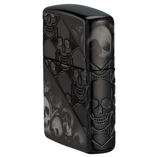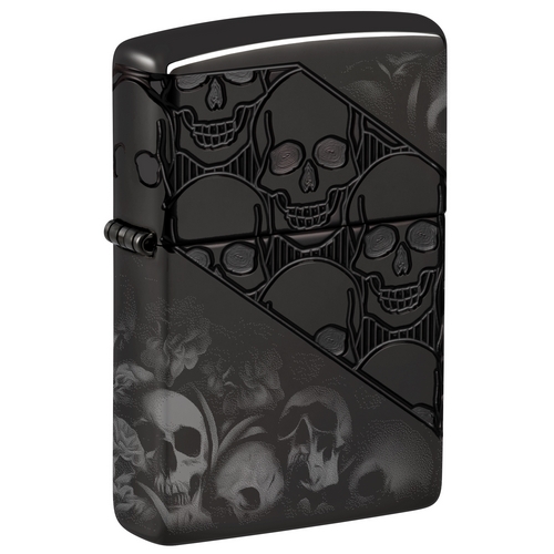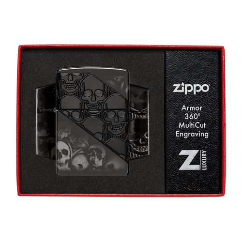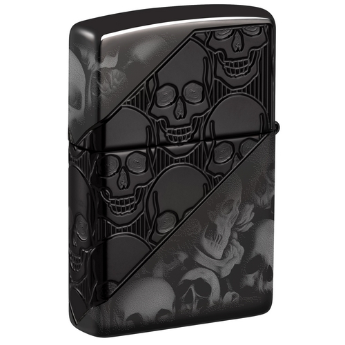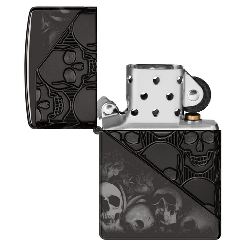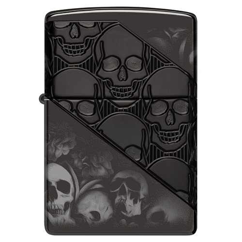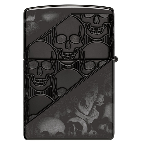Zwarte Zippo met aan de voorzijde een opdruk van een Skelet.