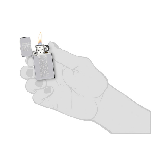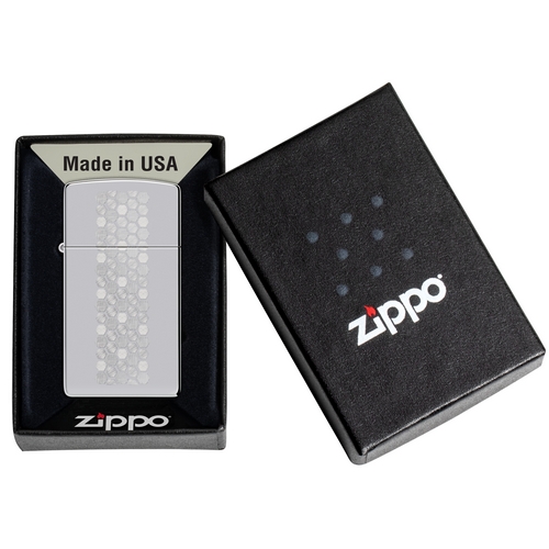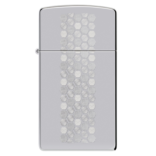 Deze smalle Zippo benzineaansteker heeft een hoogglans chrome afwerking. Met aan de voorzijde een lasergravure van een Honinggraad patroon.