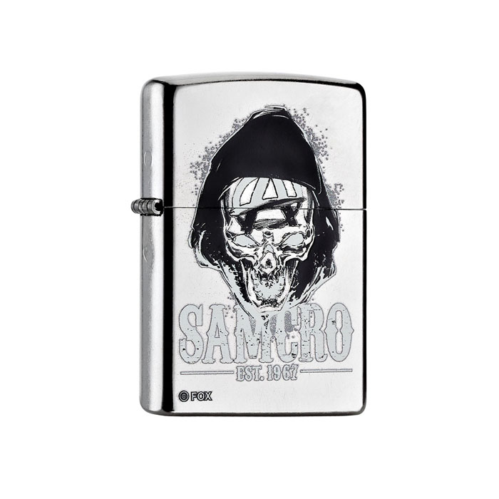 Hoogglans chromen Zippo aansteker met aan de voorzijde een opdruk van een schedel met het Anarchy symbool en de tekst: "SAMCRO EST.1967".