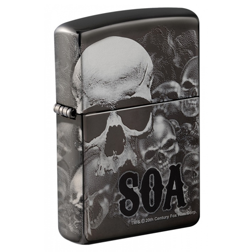 Zippo Sons of Anarchy Skull Black Ice. Deze Zippo aansteker heeft een black ice afwerking met aan de voorzijde een opdruk van het Sons of Anarchy logo. De hele zippo is bedrukt met verschillende schedels. Een Zippo aansteker is een zeer kwalitatieve aanstekers met de welbekende levenslange garantie, dit betekend dat de Zippo aansteker bij een defect gratis wordt gerepareerd.
