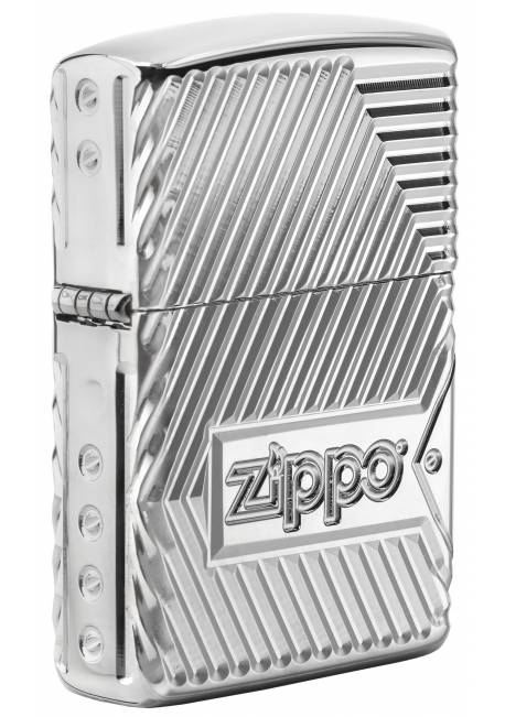Deze hoogglans chromen aansteker is geheel voorzien van een diepe gravure. Aan de voor- en achterzijde is het Zippo logo gegraveerd in diepe lijnen en aan de zijkanten zijn diverse klinknagels afgebeeld.