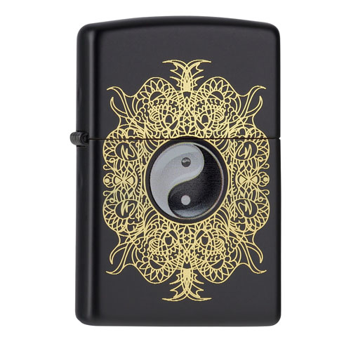 Mat zwarte Zippo aansteker met in het midden een Yin Yang teken. Rondom het Yin Yang teken is een sierlijke gravure gegraveerd.