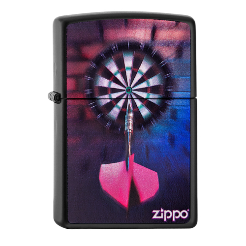 Mat zwarte Zippo aansteker met aan de voorzijde een opdruk van een dart pijl die naar het dartbord vliegt.