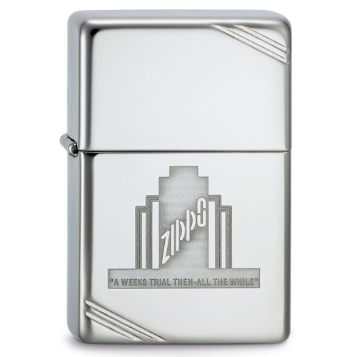 Zippo aansteker met een hoogglans chromen afwerking en aan de voorzijde een opdruk van het een...