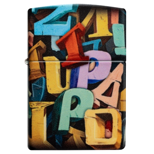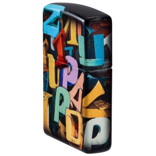 De Zippo Abstract Design heeft over de gehele aansteker een kleurprint waarop 3D letters te zien zijn.