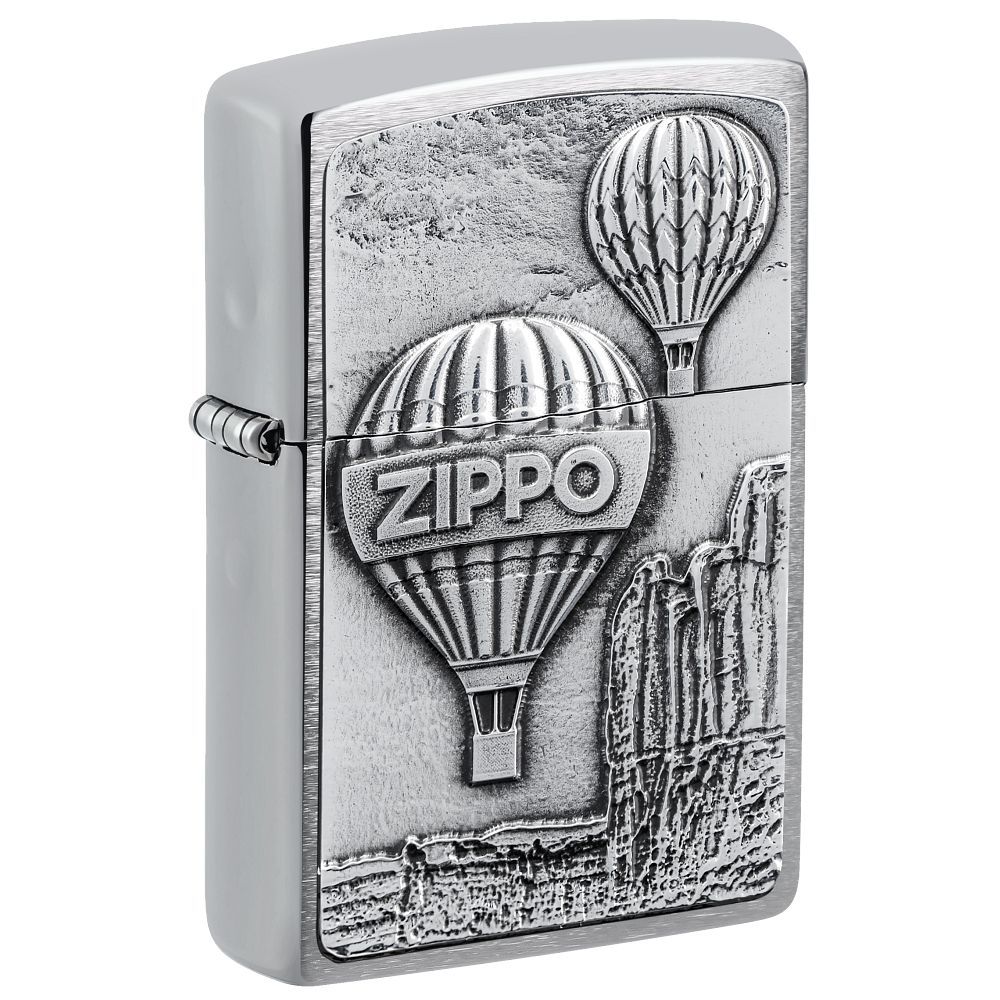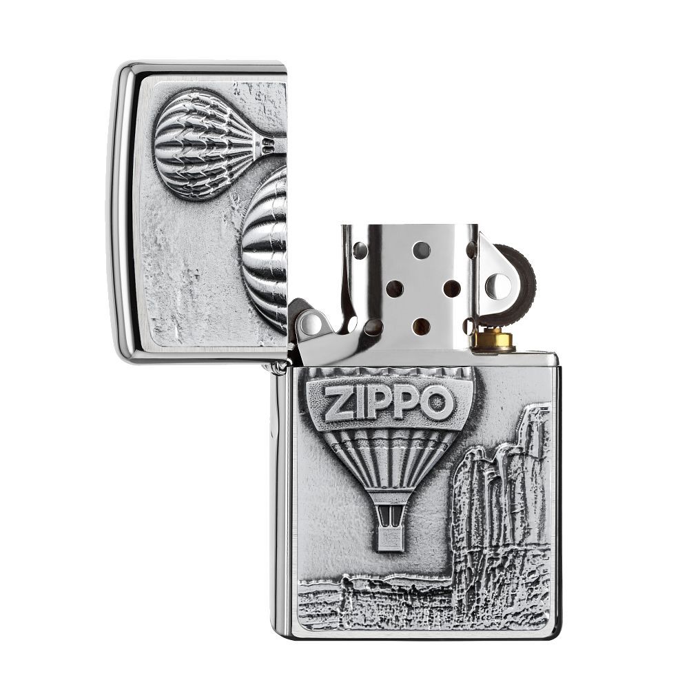 Deze aansteker heeft een gebrosteld chromen afwerking aan de voor en achterzijde met rondom een hoogglans afwerking. De voorzijde van de aansteker is voorzien van een 3D embleem waarop een luchtballon met de tekst Zippo erin is te zien.