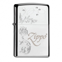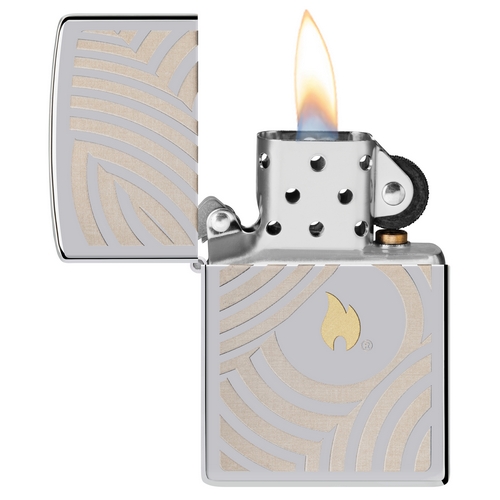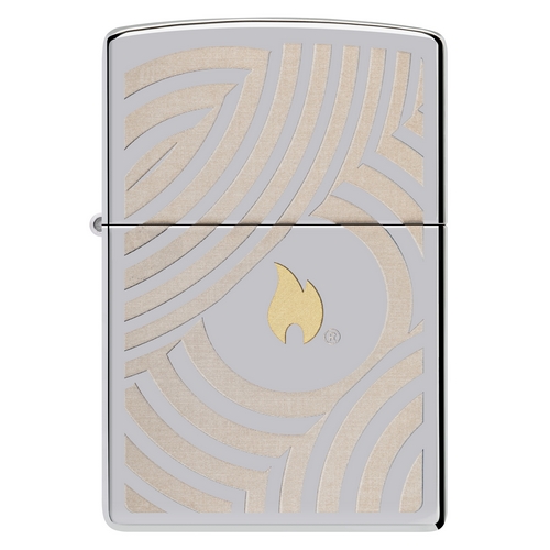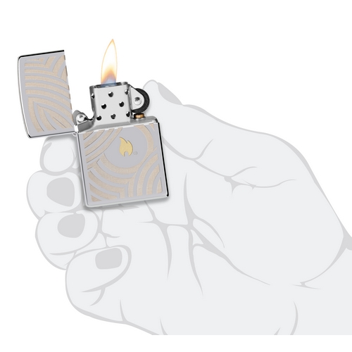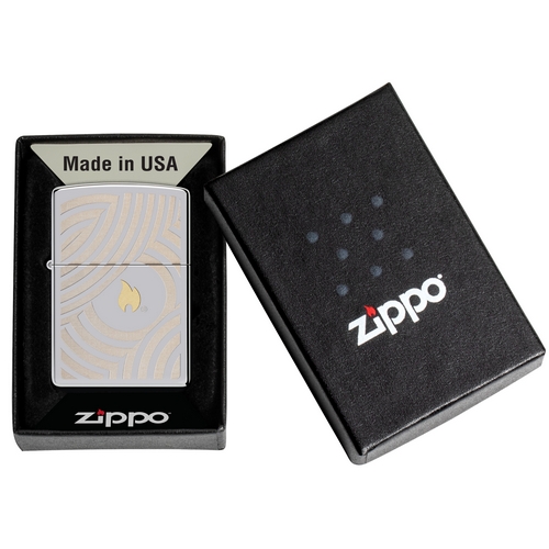 De Zippo Flame and Circles Design is hoogglans chrome afgewerkt met aan de voorzijde een lasergravure van de Zippo flame met cirkels eromheen.