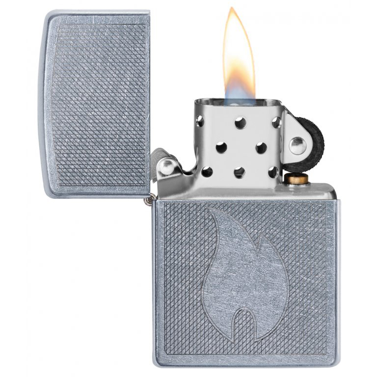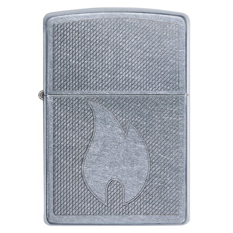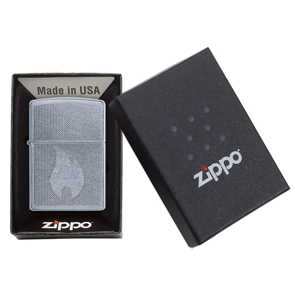 Zippo aansteker met een dusted chromen afwerking en aan de voorzijde een opdruk van het Zippo Flame...