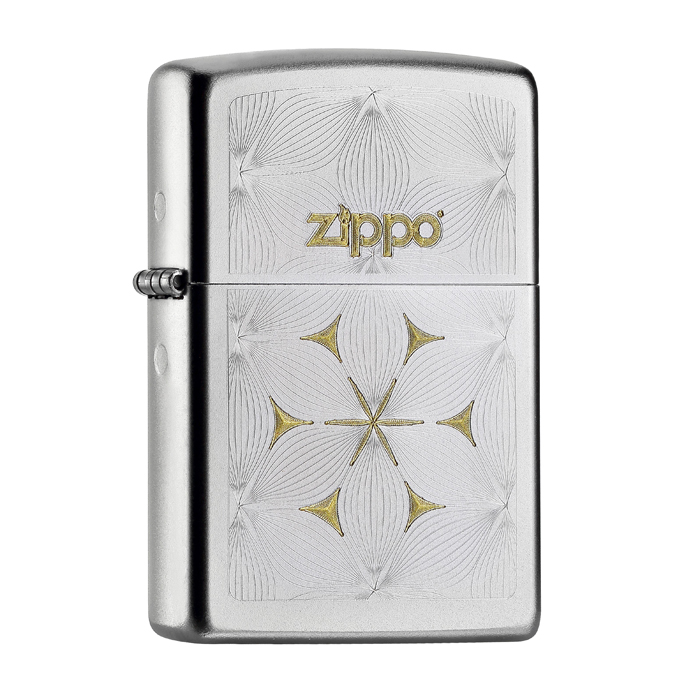 Zippo aansteker met een geborstelde chromen afwerking en aan de voorzijde een embleem van het Zippo...