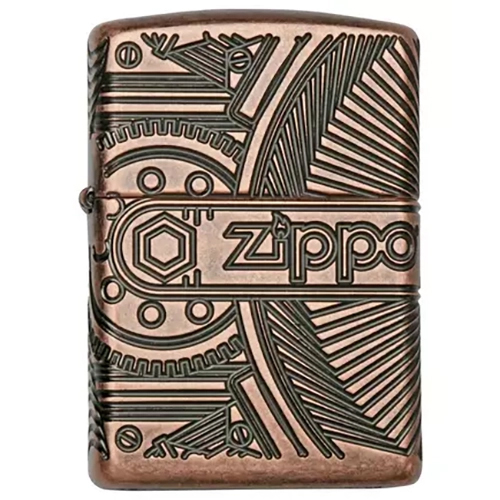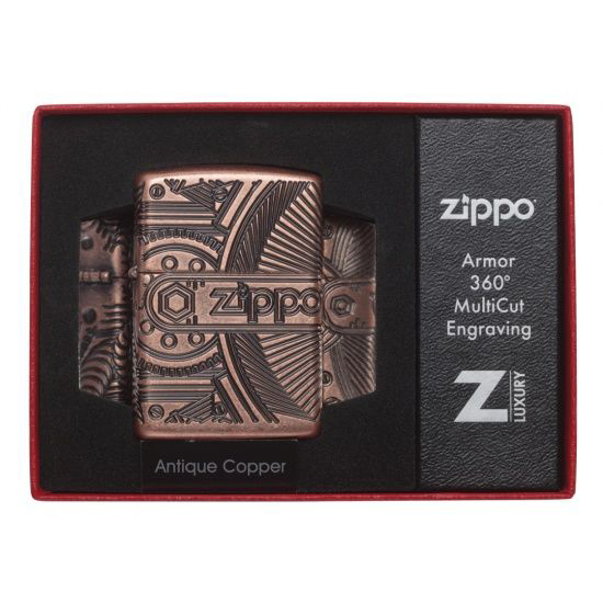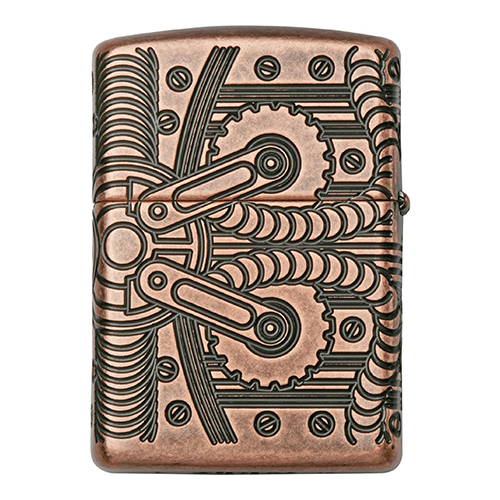 Deze Armor Case in hoogglans roségouden uitvoering, werkt op benzine en heeft een 360 graden Multicut engraving met een tandwielpatroon.