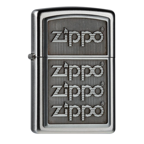 Mat chromen Zippo aansteker met aan de voorzijde een opdruk waar een reliëf in is verwerkt met het...