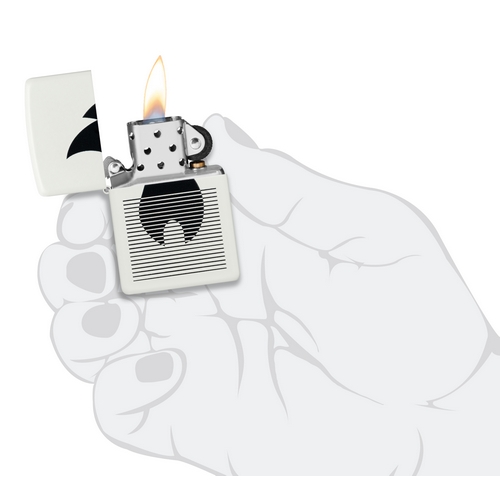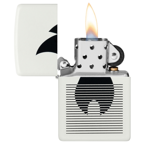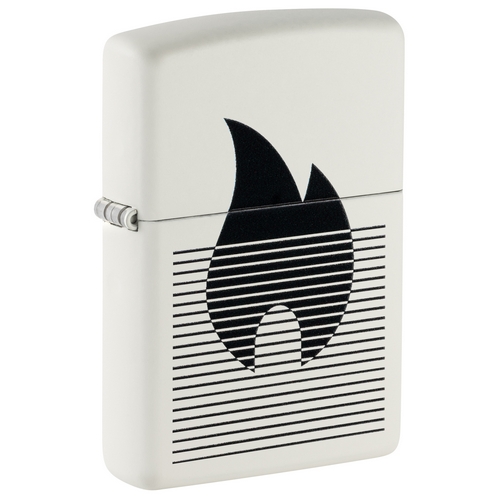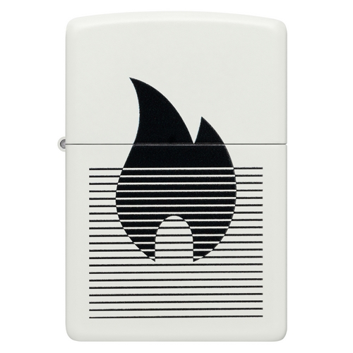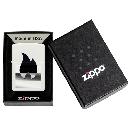 De Zippo Striped Logo Design is mat wit afgewerkt met aan de voorzijde een kleurprint, waarop een streep patroon te zien is van het welbekende Zippo logo met aan de onderzijde strepen erdoorheen.