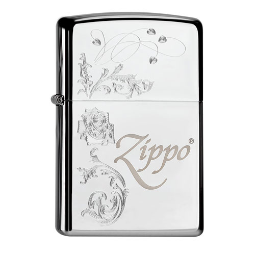 Hoogglans chromen Zippo aansteker met een sierlijke gravure en de tekst Zippo.