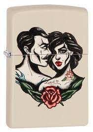 De Zippo benzine aansteker heeft een creme mat uitvoering en is aan de voorzijde voorzien van een slijtvaste print van een Man en vrouw onder de tattoos..