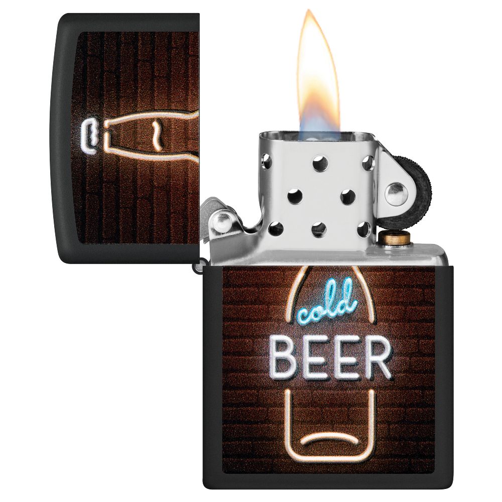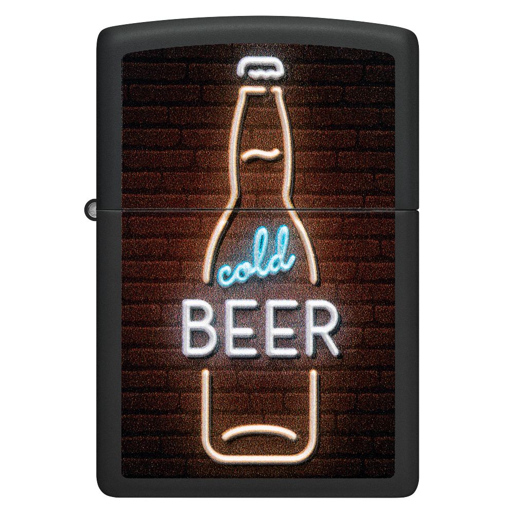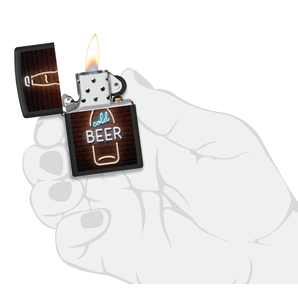 De Zippo Beer Sign is matt zwart afgewerkt met aan de voorzijde een textuurprint van een Cold Beer Sign.