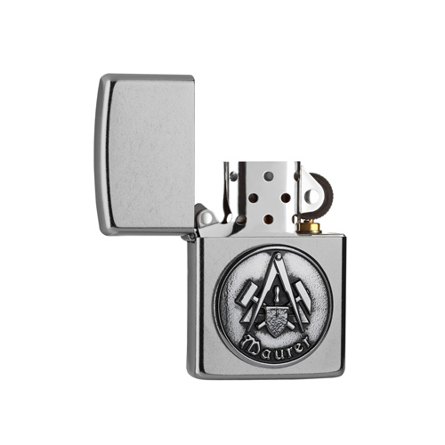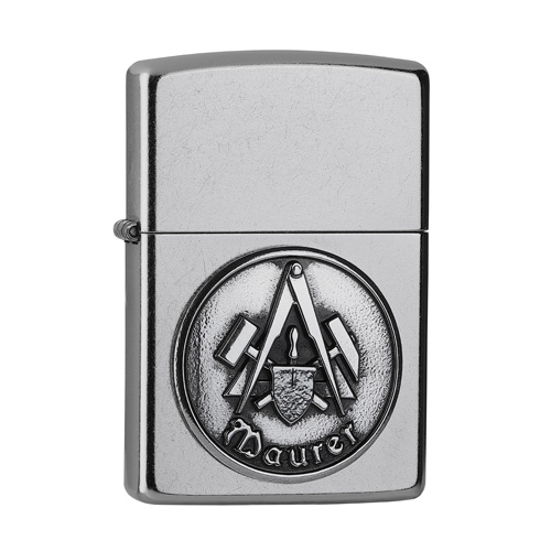 De Zippo benzine aansteker heeft een street chromen afwerking en is aan de voorzijde voorzien van een embleem van het gereedschap van een metselaar.