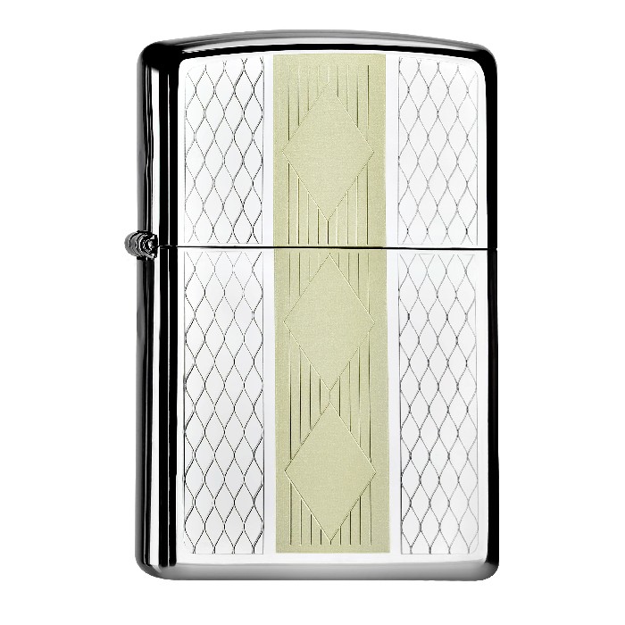 Chromen Zippo aansteker met aan de voorzijde een tweekleurig patroon van diamantvormen gegraveerd.