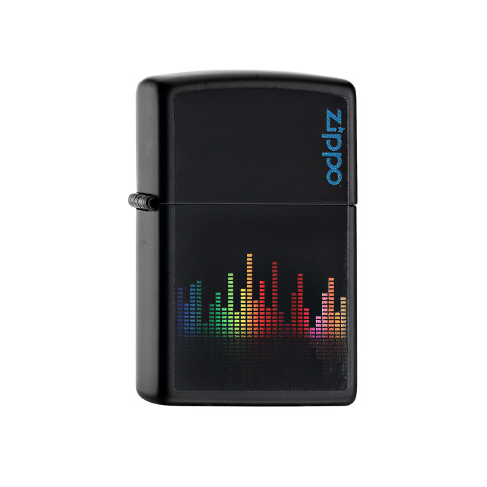 Zippo aansteker met een mat zwarte afwerking en aan de voorzijde een opdruk van een equalizer.