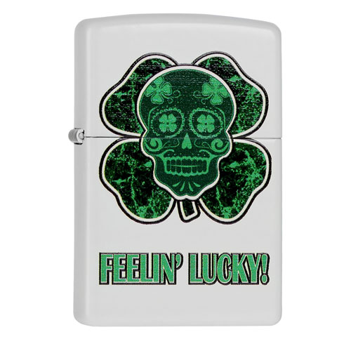 Witte Zippo aansteker met de tekst ''Feelin' Lucky'' met daarboven een klavertje vier met in het midden een doodshoofd. In het doodshoofd zijn nog 4 klavertjes vier verwerkt.