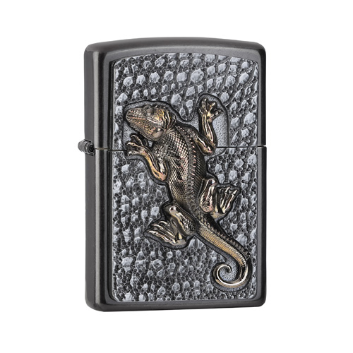 De Zippo benzine aansteker heeft een donkergrijze hoogglans afwerking en is aan de voorzijde voorzien van een embleem van een goudkleurige gecko op een rotsachtige ondergrond.