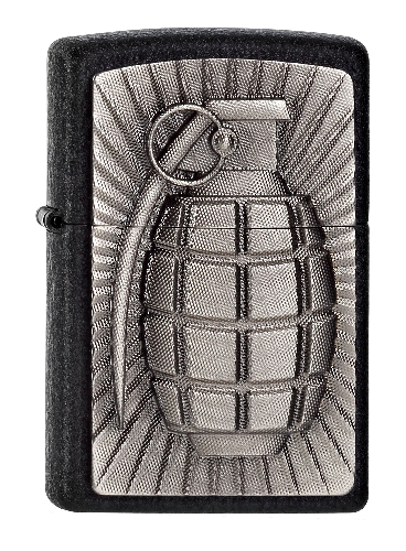 Zwarte Zippo aansteker met een embleem van een handgranaat.