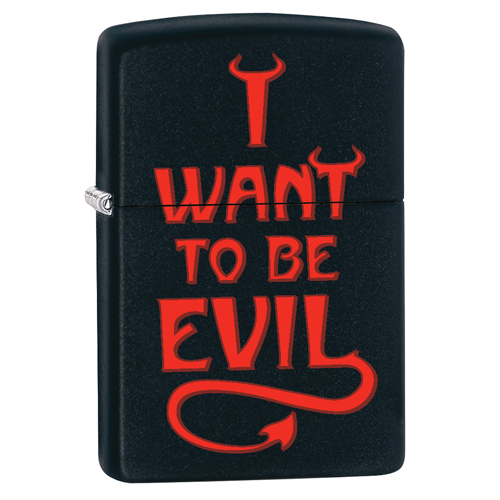 Luxe matzwarte Zippo aansteker afkomstig uit de Zippo Urban Style collectie met daarop de tekst "I want to be evil".