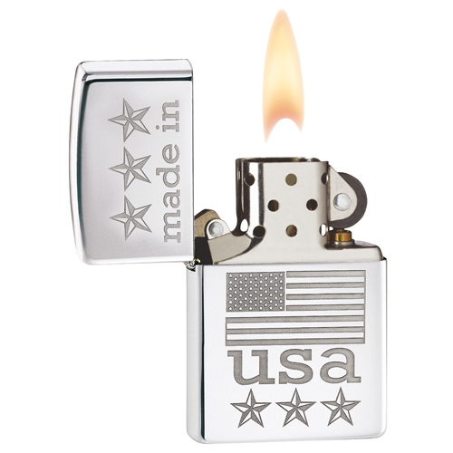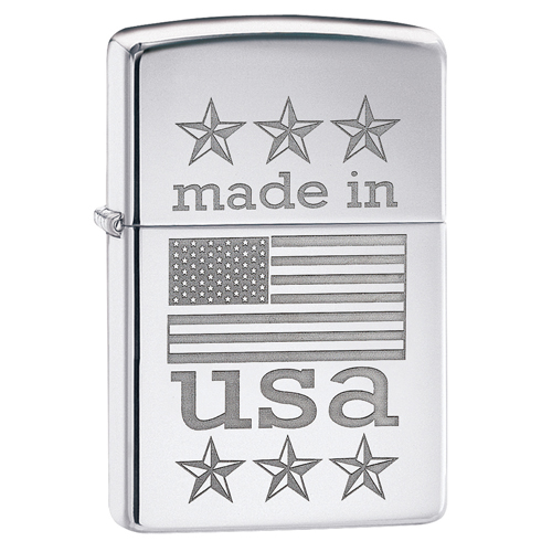 Deze hoogglans chromen Zippo aansteker heeft aan de voorzijde een gravure van de Amerikaanse vlag met 6 sterren en de tekst Made in USA.