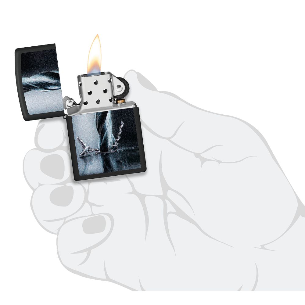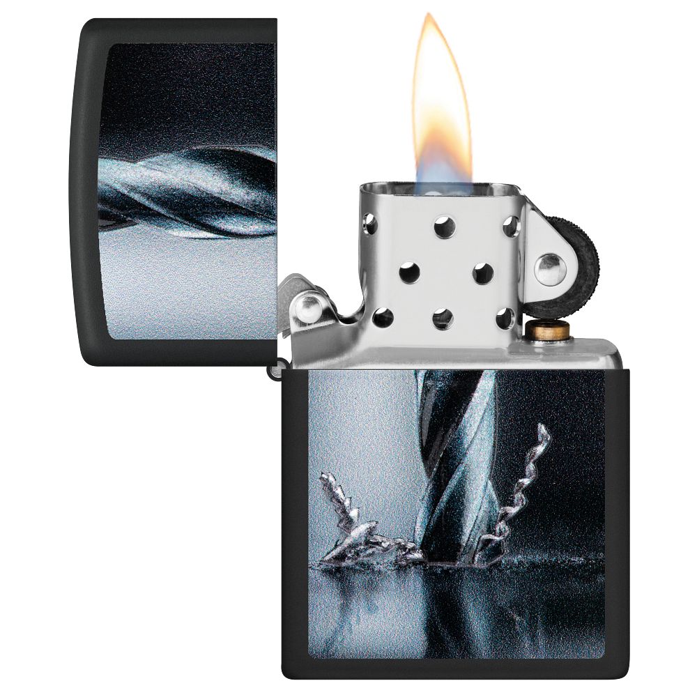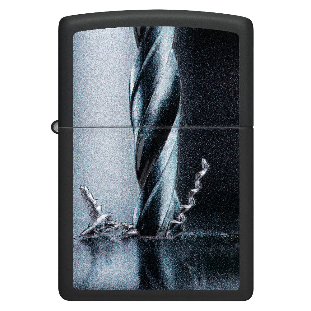 De Zippo Metal Drill Design is matt zwart afgewerkt met aan de voorzijde een kleurprint van een metale boor.