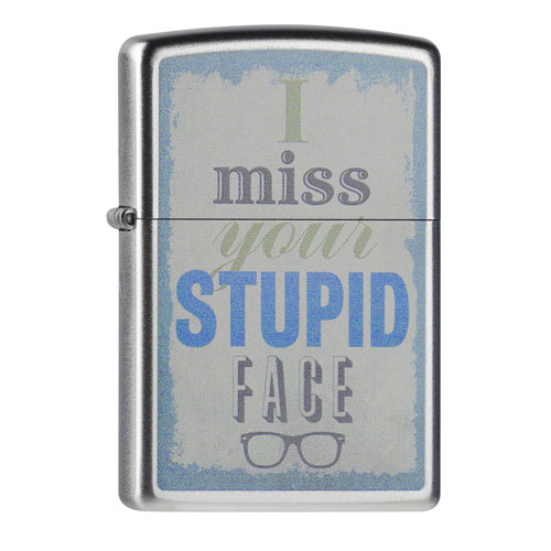 Zilverkleurige satin finish Zippo aansteker met op de voorzijde een opdruk met de tekst ''I miss your stupid face''.