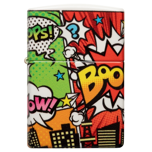 Zippo Pop Art City Design. Deze Zippo heeft een slijtvaste cartoon print in color rondom de gehele Zippo met een matte afwerking.