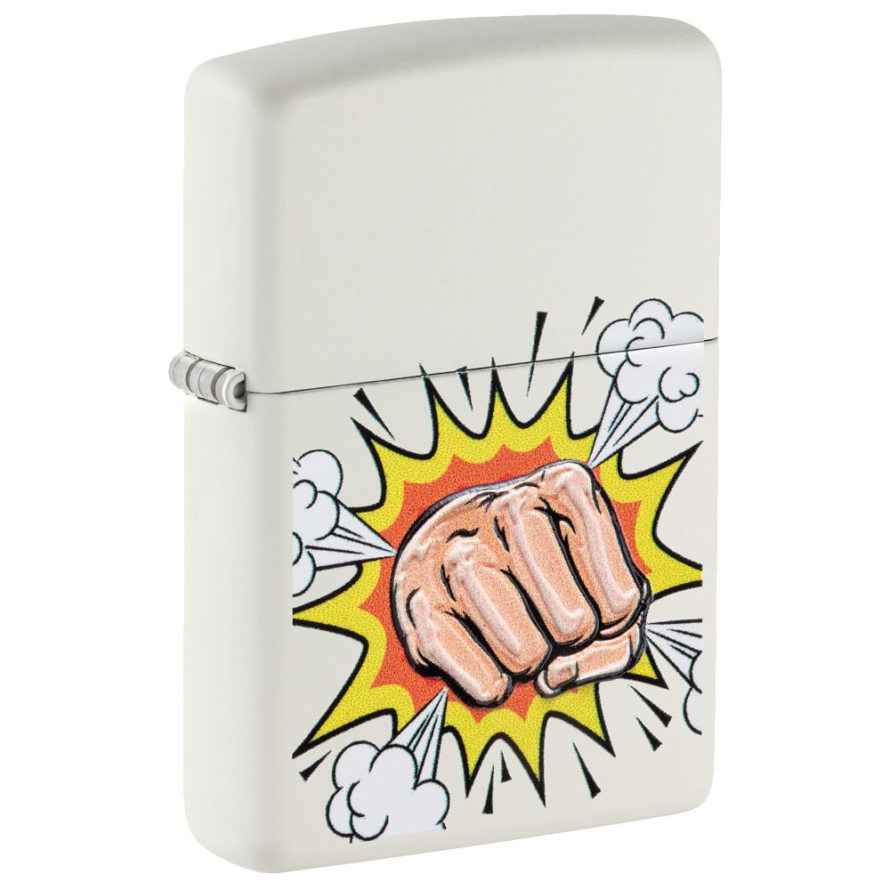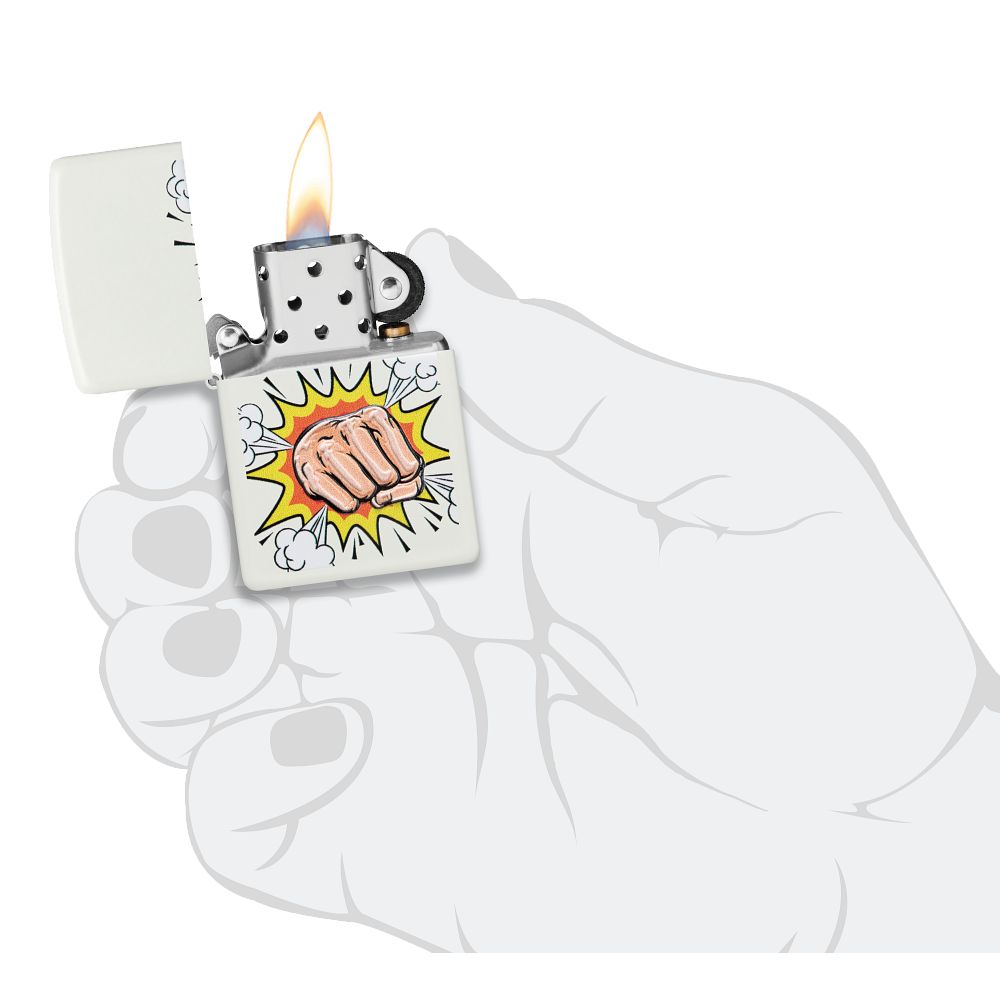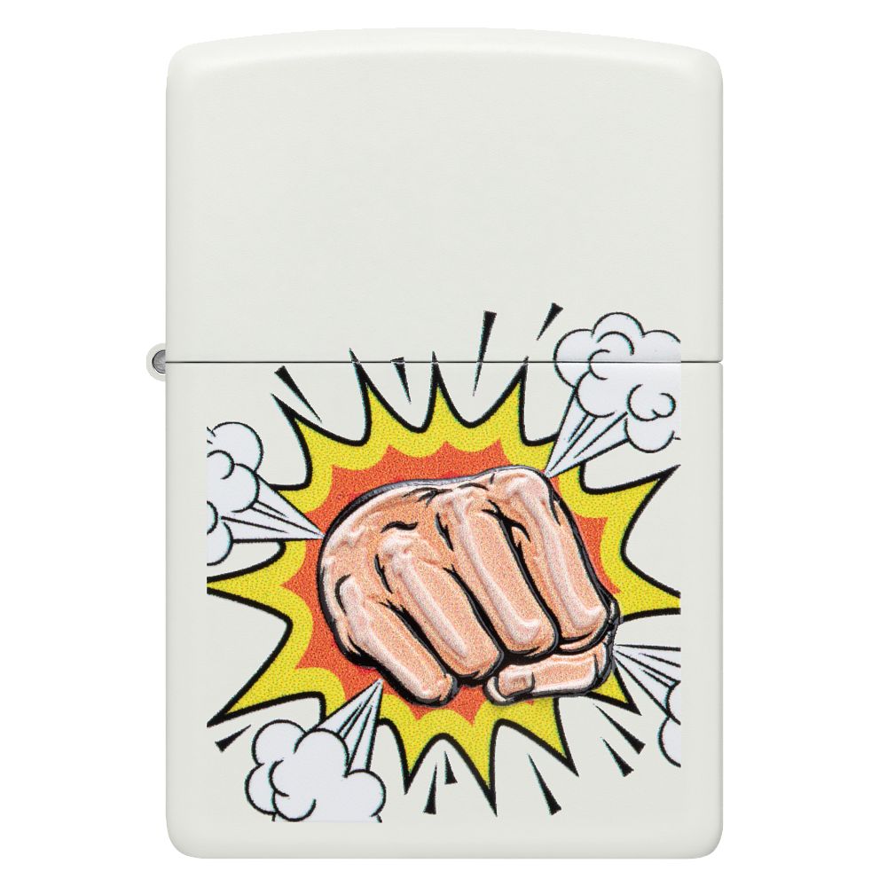 Deze Zippo heeft een Matte afwerking met aan de voorzijde een opdruk van een Cartoon Vuist