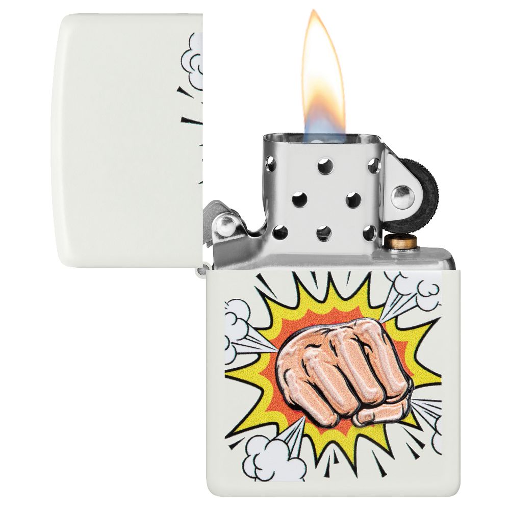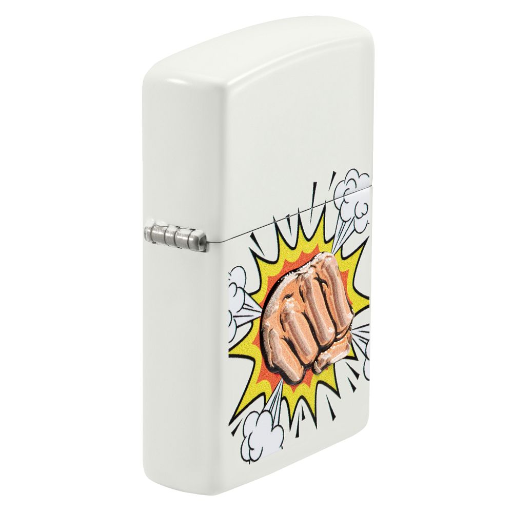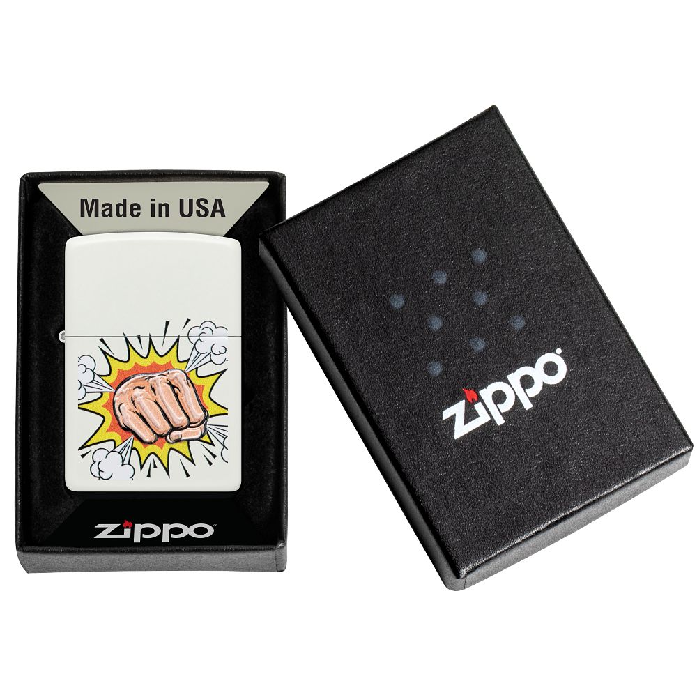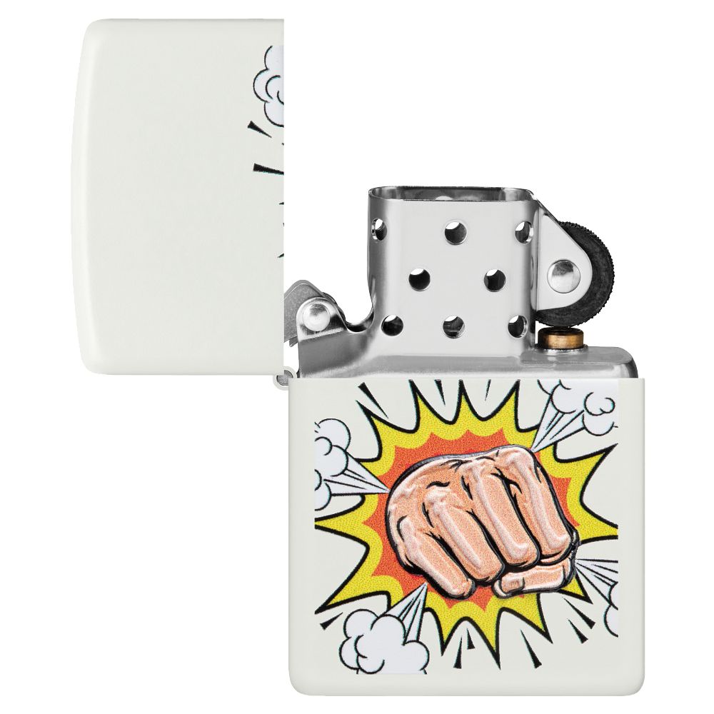 Deze Zippo heeft een Matte afwerking met aan de voorzijde een opdruk van een Cartoon Vuist