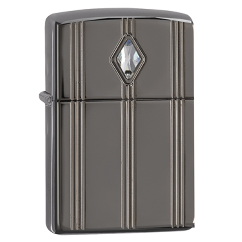 De Zippo benzine aansteker heeft een Armor Case model en is uitgevoerd in de kleur Black Ice. Aan de voorzijde is de aansteker voorzien van 3 verticale graveerlijnen met in de middelste lijn op het klepje een Swarovski steen.