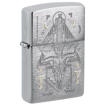 De hoogglans chromen Zippo is aan de voorzijde voorzien van een gravure van een koeienschedel met cacti erboven.