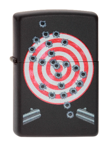 Zwarte Zippo aansteker met een afbeelding van een schietschijf met kogelgaten in de vorm van een dollarteken. Onderaan de schietschijf zjin twee geweerslopen afgebeeld.