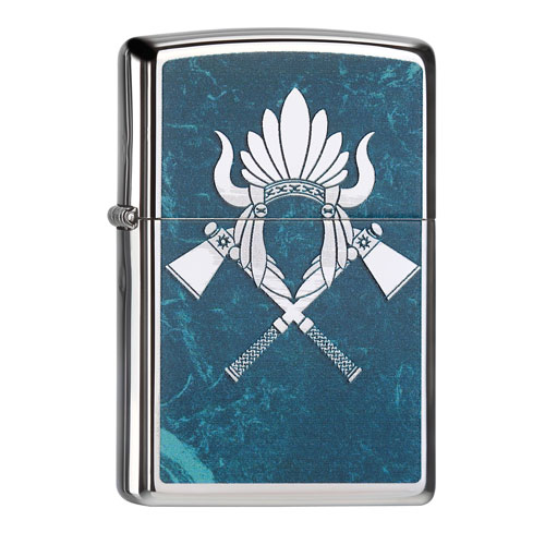 Zippo aansteker met een blauw-witte opdrauk van een indianen tooi met twee bijlen.