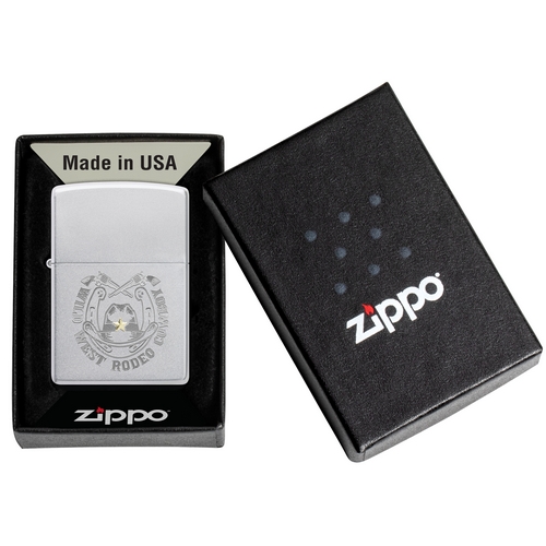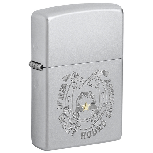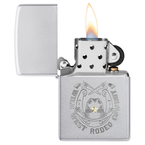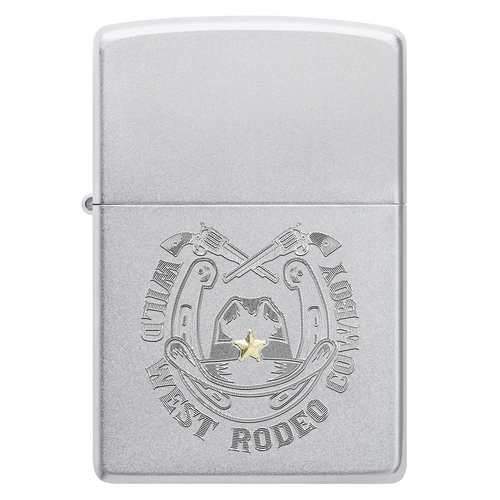 De Zippo Wild West Cowboy Design  is satin chrome afgewerkt met aan de voorzijde een gravure van een 2 kleurige design waarop een cowboy hoed, hoefijzer en 2 pistolen te zien zijn. Ook is de tekst 'Wild West Rodeo cowboy hierop gegraveerd.