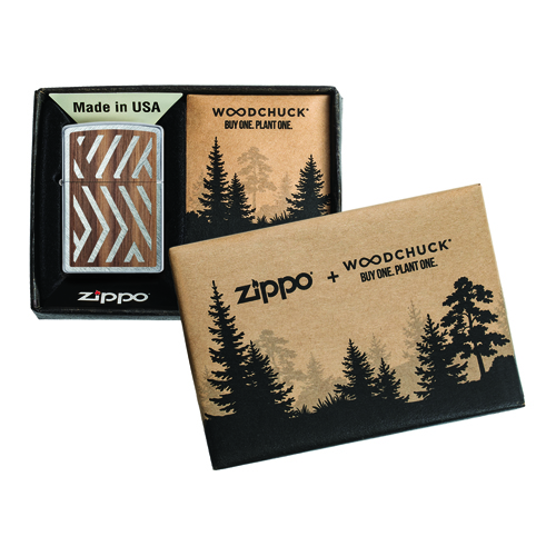 Aan de achterzijde is een laser gravure aangebracht met het logo en de slogan van Woodchuck USA. Wanneer u de Zippo Woodchuck koopt, wordt er door Woodchuck een nieuwe boom geplant.