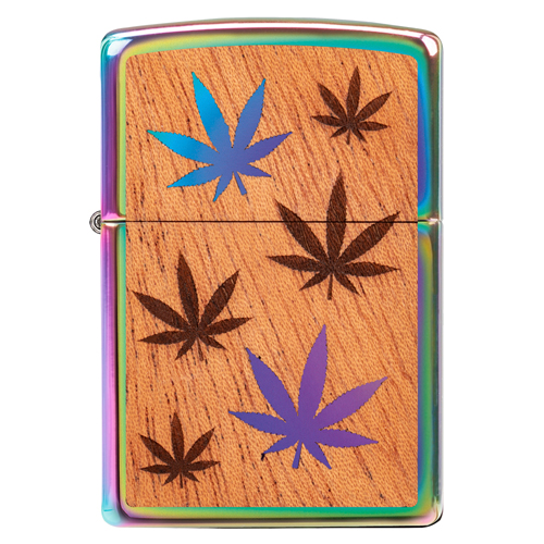 De hoogglans multicolor Zippo is voorzien van een dun laagje mahoniehout waarbij aan de voorzijde uitsnedes zijn gemaakt van hennepbladeren.