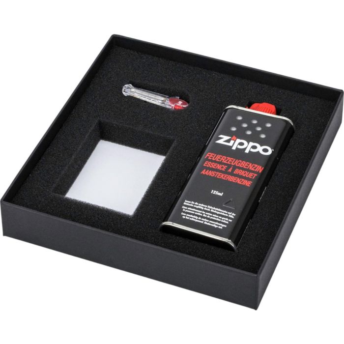 Deze luxe giftset bevat een flacon Zippo benzine en een setje vuursteentjes (6 stuks).