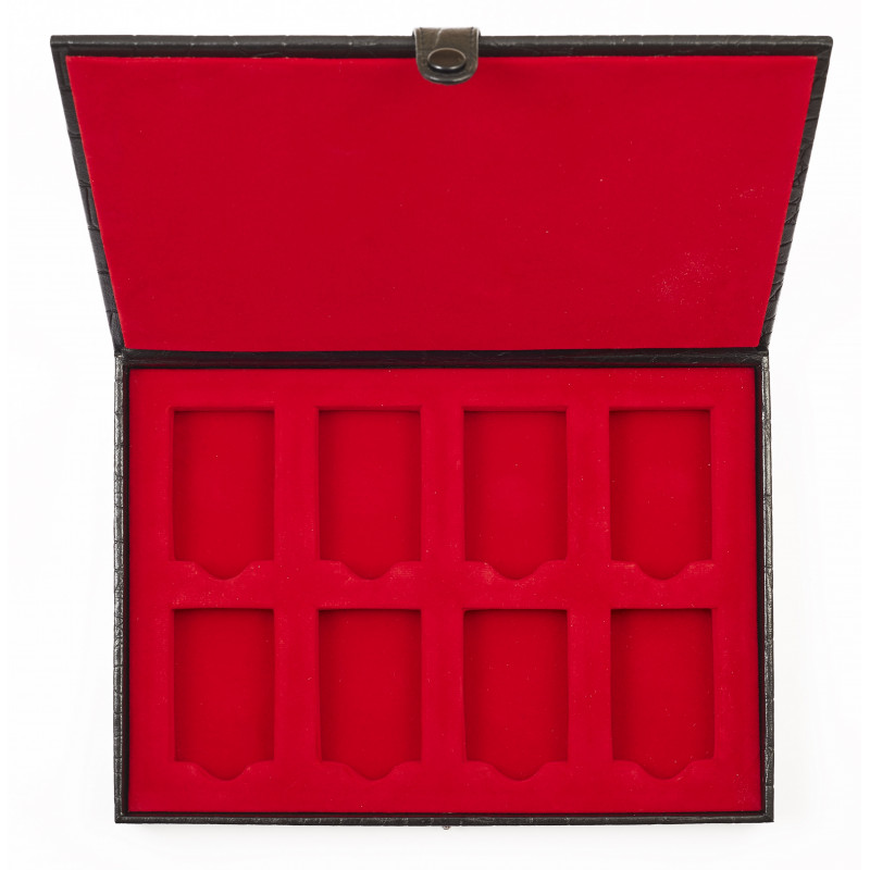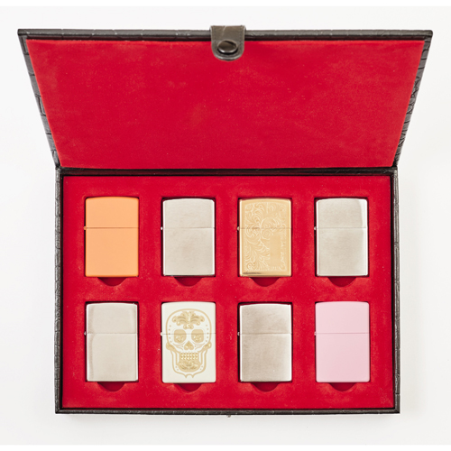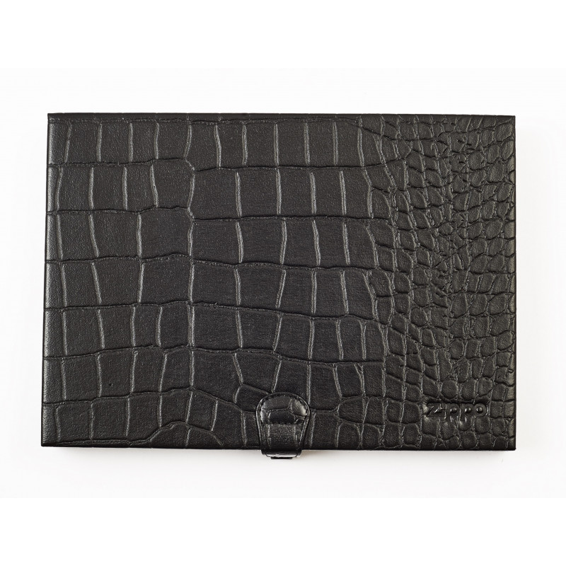 Zippo verzameldoos met ruimte voor 8 standaard Zippo's. De buitenzijde is van zwart leer met krokodil structuur en is voorzien van het Zippo logo, de binnenzijde is afgewerkt met rood fluweel.