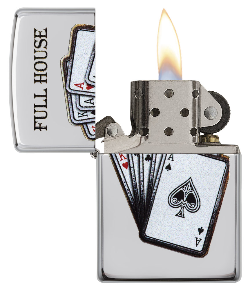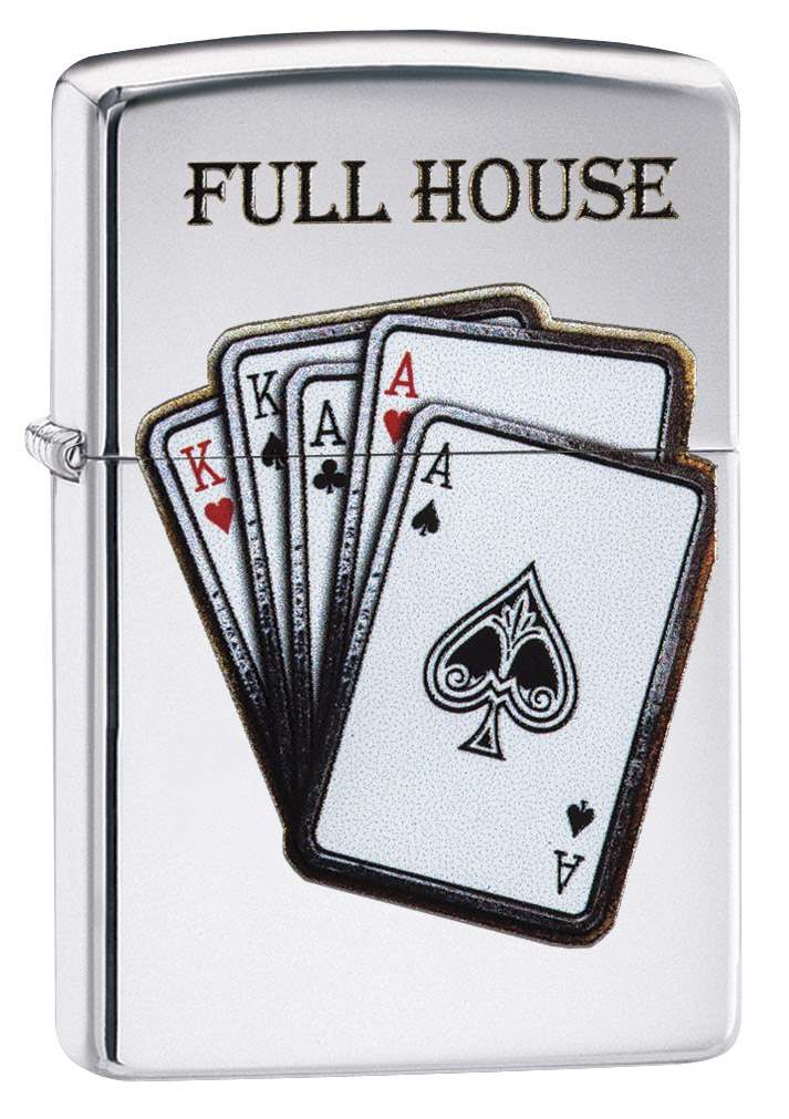 Zippo aansteker Full House. Deze Zippo aansteker heeft een Hoogglans chromen afwerking. Aan de voorzijde van deze Zippo aansteker bevindt zich een opdruk van een Full House van Azen. Een Zippo aansteker is een zeer kwalitatieve aansteker met de welbekende levenslange garantie, dit betekend dat de Zippo aansteker bij een defect gratis wordt gerepareerd.